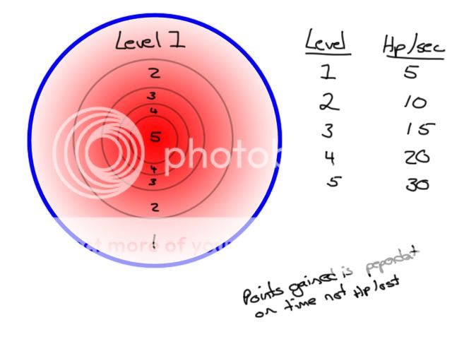 points are rewarded depending on the how long u take damage not how much. in the centre i said -30 hp/sec (thinking back this might need to be a lot higher) so this means that if you had 2000 armour (like 40% damamge reduction) then u would get 30 points per sec for how ever long u stayed in the area.